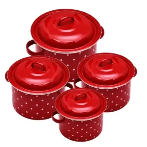 Комплект Емайлирани тенджери – 8 части, Червени на бели точици, Размери: Ø18, 20, 22, 24 см, Бял интериор и предпазен пръстен