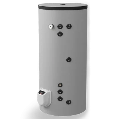 – с две серпентини – за комбинирано използване на два топлоизточника. Значителни икономии на електроенергия могат да се постигнат чрез подходящо комбиниране на режимите на отопление през всеки сезон. Горната серпентина работи в проточен режим и се свързва към и котел или камина с водна риза; долната серпентина работи в акумулиращ режим и е подходяща за свързване към слънчев колектор или термопомпа.