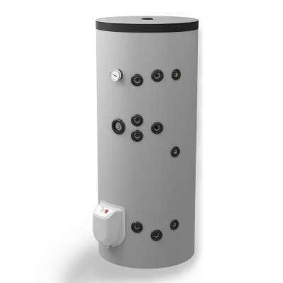 – с две серпентини – за комбинирано използване на два топлоизточника. Значителни икономии на електроенергия могат да се постигнат чрез подходящо комбиниране на режимите на отопление през всеки сезон. Горната серпентина работи в проточен режим и се свързва към и котел или камина с водна риза; долната серпентина работи в акумулиращ режим и е подходяща за свързване към слънчев колектор или термопомпа.