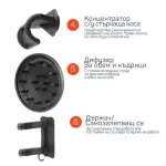 - 5 приставки – Дифузер за обем, 2 концентратора, Специална иновативна приставка срещу разпиляна и хвърчаща коса, Моделиращ струята адаптер