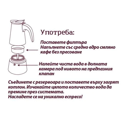 | Описание | Насладете се на ароматно еспресо с тази кафеварка за котлон.