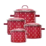 Комплект Емайлирани тенджери – 8 части, Червени на бели точици, Размери: Ø18, 20, 22, 24 см, Бял интериор и предпазен пръстен