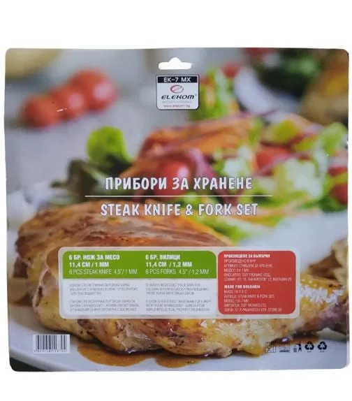 Ключови думи: комплект ножове и вилици, 12 части, висококачествена неръждаема стомана, дървена дръжка, EK-7 MX, прибори за хранене, ножове за месо, вилици за хранене.