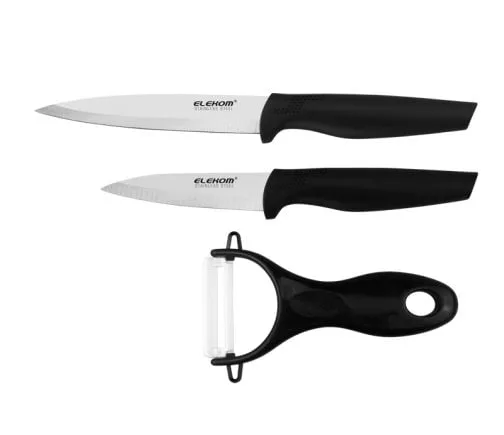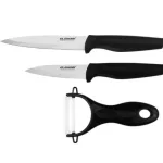 Този комплект от 4 части включва универсален нож (12,7 см х 1,2 мм), нож за белене (8,9 см х 1,2 мм) и нож за белене с керамично острие. Дъската за рязане (29х19 см х 2,5 мм) допълва комплекта, осигурявайки удобство и функционалност. Перфектен за ежедневна употреба, този комплект ще направи готвенето ви по-лесно и приятно.