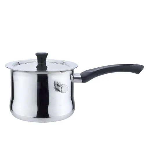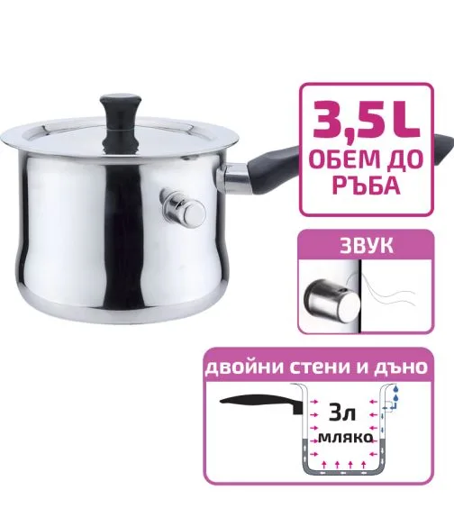 Изработена от висококачествена неръждаема стомана, тази млековарка предлага изключителна издръжливост и ефективност. С диаметър от 20 см и височина от 16,5 см, тя може да побере до 3,0 литра мляко, а общият й обем до ръба е 3,5 литра. С дебелина на стените от 0,6 мм и двуслойни стени и дъно, млековарката гарантира равномерно разпределение на топлината. Оборудвана със звукова сигнализация и индукционно дъно, тя е съвместима с всички видове котлони. Изберете млековарка ЕК-35 МР за перфектно приготвено мляко всеки път!
