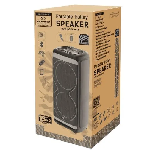 Преносима Тонколона EK-1299 XB • Мощни 2х15-инча високоговорители с LED осветление и два безжични микрофона. Новият модел луксозна тонколона ЕК-1299 XB предлага дисплей, FM тунер, дистанционно управление и Bluetooth функция. С вградена презаредима батерия, тази тонколона е идеална за улични музиканти, купони, презентации и караокета в хотели и ресторанти. Супер мощен 18-инчов басов говорител и 5-инчов пищял осигуряват екстра бас и приоритет за микрофон. Включва функции като USB, FM, TF карта, TWS, AUX вход и EQ. Лесно преносима с разтегателна дръжка и колелца. Максимална мощност: 2400W.