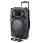 Супер мощен и луксозен модел тонколона за караоке с Дисплей, FM тунер, Дистанционно, Bluetooth функция, безжични микрофони 2 бр. и вече с още по-голям и по-мощен 12 инчов басов говорител + 5 инчов пищял. Идеална за улични музиканти, купони, презентации, караокета в хотели, ресторанти и др. Колоната е много удобна и за ползване на места където няма електричество, тъй като е с вграден мощен акумулатор.