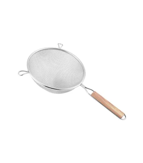 Цедка EK-015W-14 с две уши и дървена дръжка • Висококачествена неръждаема стомана, Диаметър 14 см, Дължина 30 см. Идеална за прецеждане на различни течности и съставки. Здрава и устойчива конструкция за дълготрайна употреба.