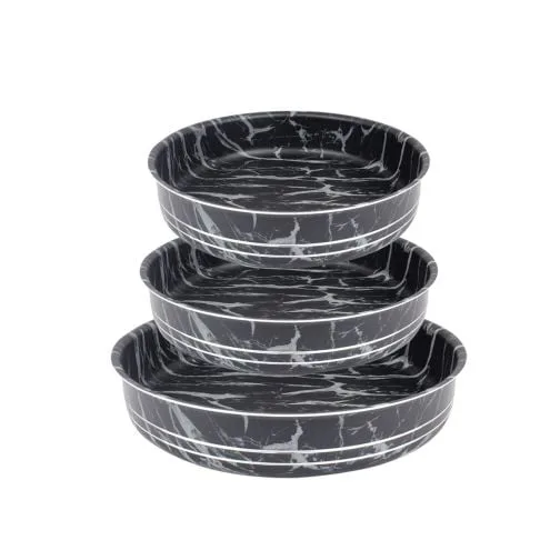 Открийте перфектния комплект кръгли тави за печене с размери 28х5,0 см, 30х5,5 см и 34х6,3 см. Изработени от висококачествен алуминий с мраморно покритие, тези тави предлагат изключителна устойчивост и незалепващо покритие. Подходящи за измиване в миялни машини, те осигуряват равномерно загряване и не съдържат PTFE, PFOA и тежки метали. Идеални за всяка кухня, тези тави ще направят печенето лесно и приятно.