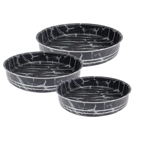 Открийте перфектния комплект кръгли тави за печене с размери 28х5,0 см, 32х6 см и 36х6,5 см. Изработени от висококачествен алуминий с мраморно покритие, тези тави предлагат изключителна устойчивост и незалепваща повърхност. Подходящи за измиване в миялни машини, те осигуряват равномерно загряване и не съдържат PTFE, PFOA и тежки метали. Идеални за всяка кухня, тези тави ще направят печенето лесно и приятно.