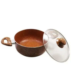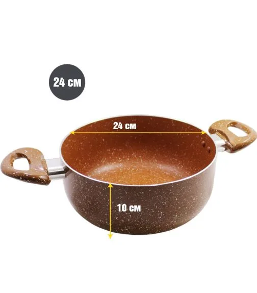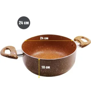 Тази тенджера със стъклен капак и мраморно покритие е пресована от висококачествен и здрав алуминий, което гарантира дълготрайност и надеждност. Мраморното покритие е устойчиво и незалепващо, осигурявайки лесно готвене и почистване. Равномерното загряване и термоизолираните дръжки правят готвенето безопасно и удобно. Термоустойчивият стъклен капак с отвор за пара позволява контрол на процеса на готвене. Тенджерата е съвместима с всички източници на топлина, с изключение на индукционни котлони, и е подходяща за почистване в съдомиялна машина. С дебелина от 2,2 мм и размери 24 х 10 см, тя предлага обем от 4,5 литра, идеален за приготвяне на разнообразни ястия. Изберете Тенджера ЕК-24 MBR за перфектни резултати в кухнята!