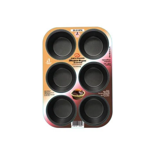 Формата за печене на мъфини ЕК-6 MFN, комплект от 6 броя, е изработена от въглеродна стомана с специално незалепващо покритие, което улеснява изваждането на готовите мъфини. С размери 26х18х2,5 см и равномерно загряване, тя осигурява отлични резултати при всяко печене. Препоръчва се използването на дървен или пластмасов прибор за поддържане на покритието. След употреба формата се залява със студена вода и се почиства лесно с гореща вода и мека гъба, без използване на абразивни средства. Компактният дизайн позволява удобно съхранение в кухнята.