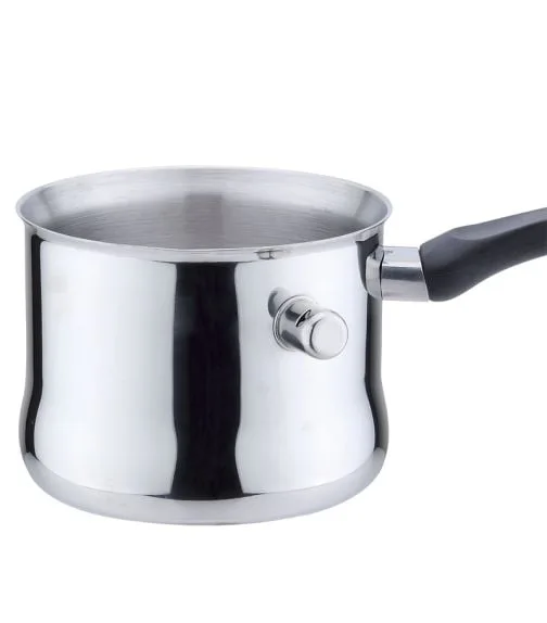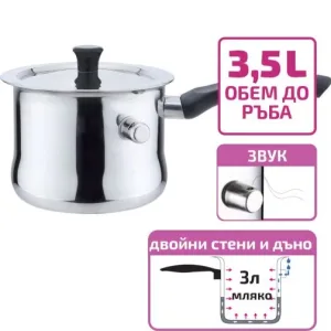Изработена от висококачествена неръждаема стомана, тази млековарка предлага изключителна издръжливост и ефективност. С диаметър от 20 см и височина от 16,5 см, тя може да побере до 3,0 литра мляко, а общият й обем до ръба е 3,5 литра. С дебелина на стените от 0,6 мм и двуслойни стени и дъно, млековарката гарантира равномерно разпределение на топлината. Оборудвана със звукова сигнализация и индукционно дъно, тя е съвместима с всички видове котлони. Изберете млековарка ЕК-35 МР за перфектно приготвено мляко всеки път!
