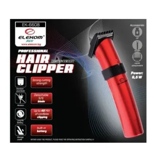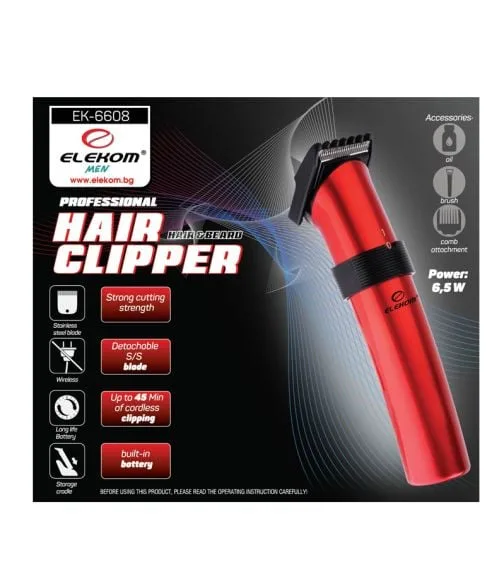 Машинка за прецизно оформяне ЕК-6608 на брадата, бакенбардите, мустаците и косата. С висококачествени стоманени остриета, тази машинка осигурява до 45 минути работа с едно зареждане. Свалящата се режеща глава и презареждащата се батерия правят поддръжката лесна и удобна. В комплекта са включени гребен-приставка, четка и масло за оптимална грижа. Захранващият адаптор работи на 220V/50Hz с мощност 6,5 W.