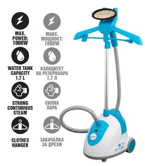 Уред за гладене с пара ЕК-801 GS • Идеалното решение за вертикално гладене! С вместимост на резервоара за вода от 1.7 литра и мощност от 1000W, този уред произвежда 30г/мин. пара за до 60 минути непрекъсната работа. Телескопичният дизайн осигурява лесна употреба и съхранение, а тялото с колелца гарантира мобилност и удобство. Уредът разполага със светлинен индикатор, ресет бутон и закачалка за прецизно гладене. Включените аксесоари като предпазна ръкавица, помощна приставка, предпазващ плат, щипка и четка за прецизно гладене с пара правят гладенето още по-лесно и ефективно. Изберете Уред за гладене с пара ЕК-801 GS за перфектно изгладени дрехи всеки път!