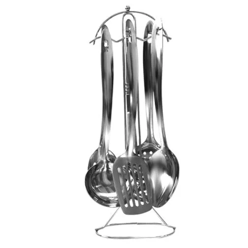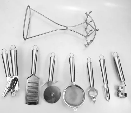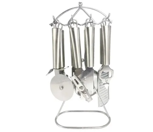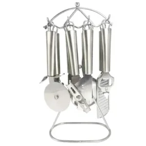 Комплект кухненски прибори ЕК-7616 SS • 8 части от висококачествена неръждаема стомана. Включва отварачка за консерви, нож за пица, ситно ренде, отварачка за напитки, белачка, цедка за чай, точило за ножове и стойка/органайзер с височина 32 см. Идеален за всяка кухня, този комплект предлага издръжливост и функционалност.