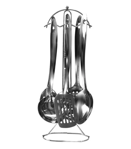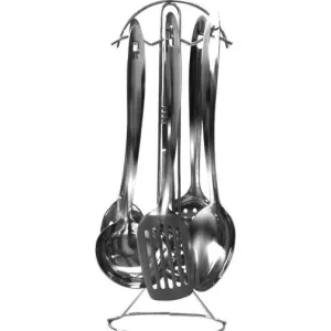 Комплект прибори EK-8892 S/S за готвене • Домакински прибори от неръждаема стомана 18/10. Комплектът съдържа 7 части: лъжица за препенване, черпак, голяма лъжица, вилица за месо, плоска решетка и стойка за маса. Идеален за всяка кухня, този комплект предлага издръжливост и стил. Подобрете готварските си умения с висококачествени прибори, които ще ви служат дълго време.