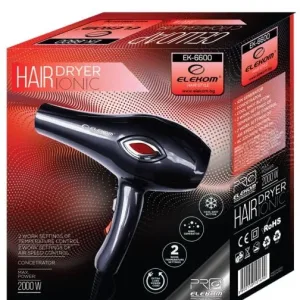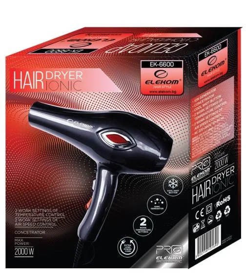 Открийте професионалния сешоар ЕЛЕКОМ ЕК-6600 в елегантен черен цвят. С мощност от 2000W и два концентратора с различни размери, този сешоар предлага изключителна производителност и гъвкавост. Благодарение на генератора на йони, косата ви ще бъде по-здрава и блестяща. Сешоарът разполага с бутон за студен въздух, две степени на регулиране на температурата и две степени на регулиране на въздушната струя, което го прави идеален за всякакъв тип коса.